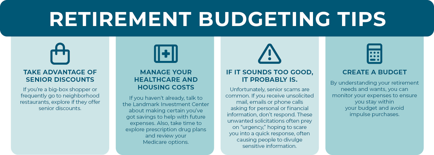 - Manage your healthcare and housing costs. If you haven’t already, talk to the Landmark Investment Center about making certain you’ve got savings to help with future expenses. Also, take time to explore prescription drug plans and review your Medicare options.
