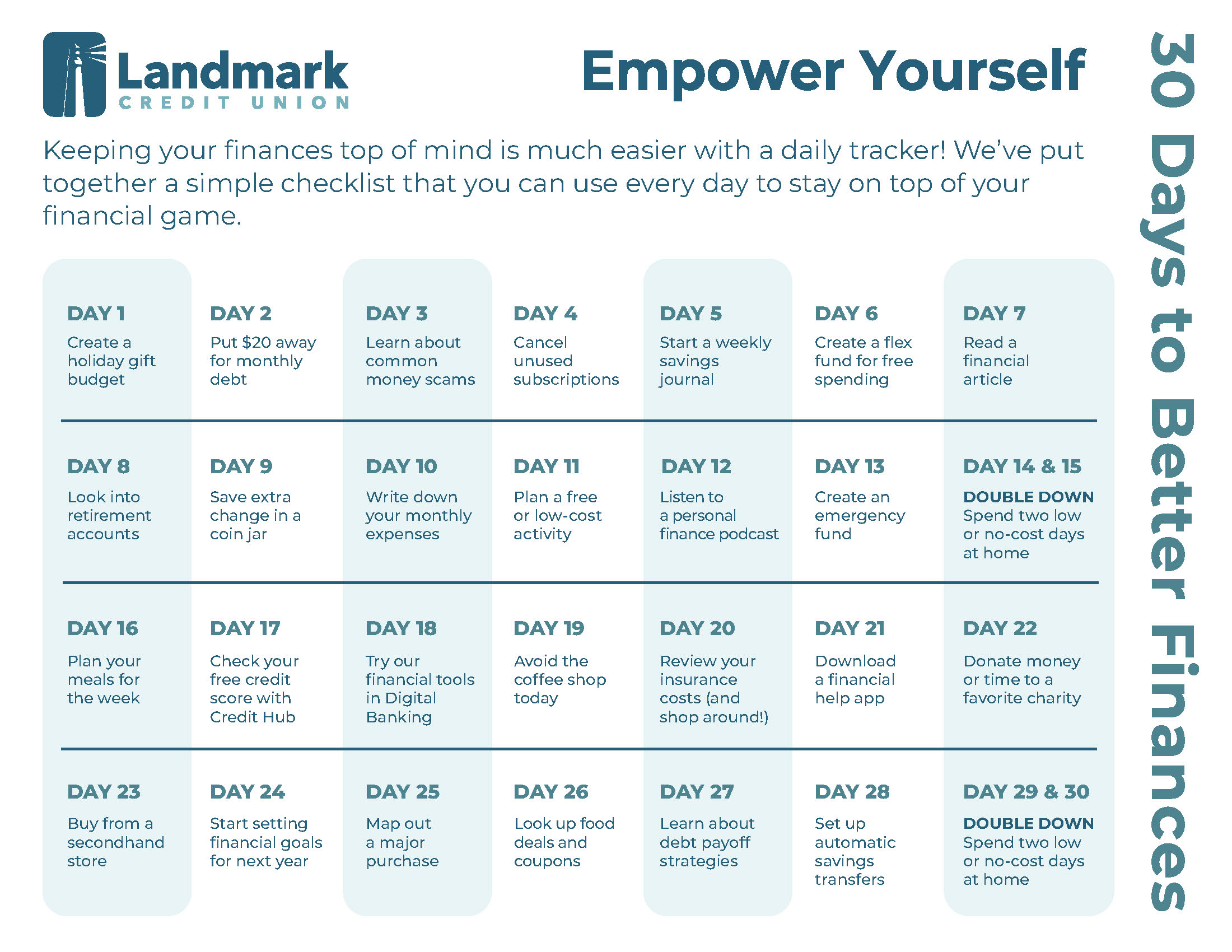 Keeping your finances top of mind is much easier with a daily tracker! Get a free copy of our 30-day savings and wellness calendar. Plus, we’ve recently updated our calendar with tips and tricks directly from our members!